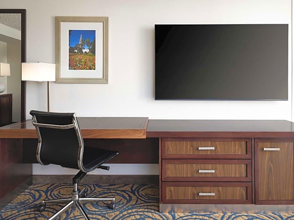 Our spacious, non-smoking, corner rooms have everything you need. Let your worries slip away when you lay your head on the Sweet Dreams by DoubleTree plush top king-sized bed with 5 jumbo hypo-allergenic down pillows. Sleep never felt so wonderful. Need to finish a project? No problem. Take a seat at our roomy desk equipped with an adjustable ergonomic executive chair, complimentary WiFi access and a desktop outlet. This mobility accessible standard junior suite features one king bed, and an accessible tub. Any corresponding photo may not reflect the specific accessible room type or room feature.