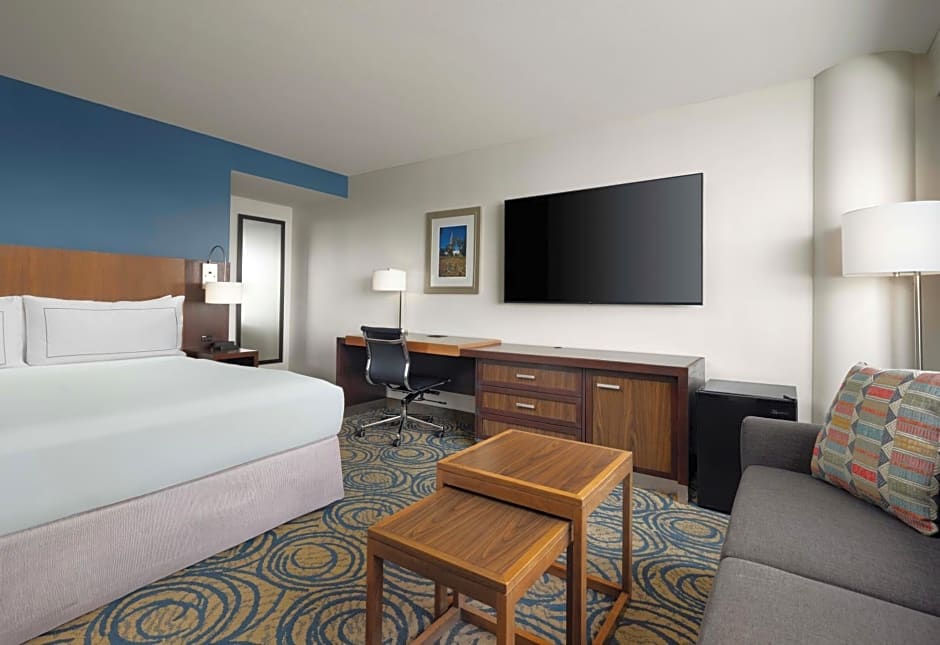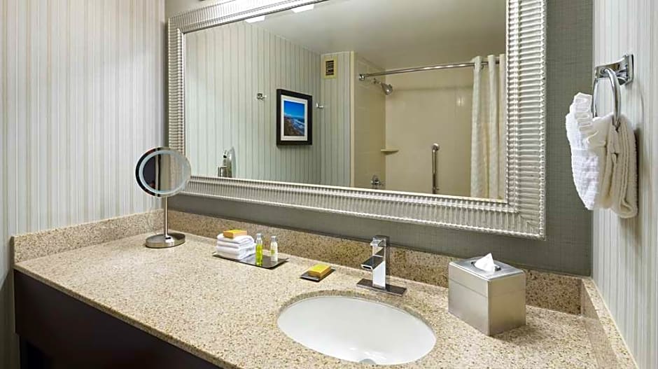 The comfort of the Sweet Dreams by DoubleTree plush top king-sized bed is the centerpiece of this well-appointed non-smoking room. Sit back and relax in one of our 2 oversized chairs with ottomans and select one of the many On Demand movies. Need to finish a project? No problem. Take a seat at our spacious desk equipped with an adjustable ergonomic executive chair, complimentary WiFi access and a desktop outlet. This mobility accessible standard room features one king-sized bed, and an accessible tub. Any corresponding photo may not reflect the specific accessible room type or room feature.